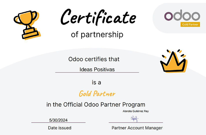 En resumen, la certificación Gold de Ideas Positivas como Partner Oficial de Odoo representa un respaldo sólido a su experiencia, conocimientos y capacidad para ofrecer soluciones integrales y de vanguardia basadas en esta potente suite de aplicaciones empresariales.
